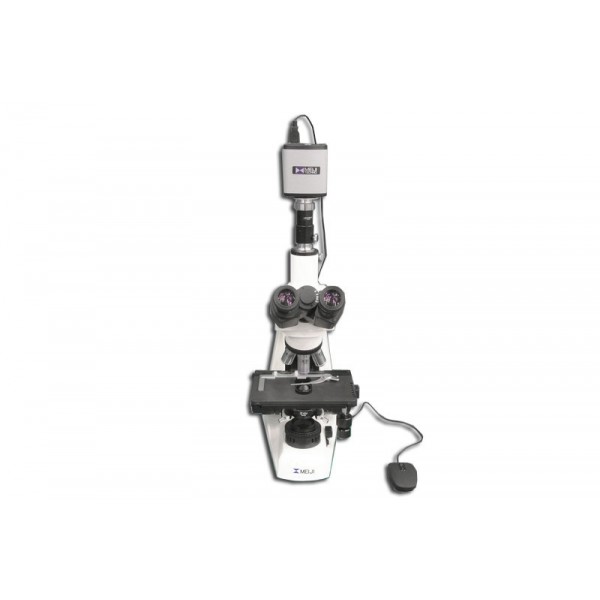 MT5300H-HD1000-LITE/0.3 Trinocular Brightfield Biological Halogen Laboratory Series is one of our most rugged fully equipped microscope systems from Japan . A modular design facilitates attachment of a variety of accessories such as CMOS/CCD HDMI video cameras, and all types of 35mm Digital SLR Cameras in the market today can be attached easily with the proper adapter set. To meet the demands of researchers and clinical laboratory specialists. When the 80/20 beamsplitter of the trinocular head is engaged for photo work, 80% of the image is directed to the phototube and 20% to the eyetube. The MT5300H-HD Series microscopes feature a new computer engineered rigid frame that incorporates low positioned coaxial coarse/fine focus controls and ergonomic stage design for maximum efficiency and comfort while providing and extremely stable platform. The cast aluminum alloy metal stand has a chemical resistant finish and is the most rugged, durable finish in the market today. Equipped tension adjustment controls and a built in stage stop lever to protect the specimen and objectives from accidental damage during use. The MT5300H Series offers an outstanding range of features and optical performance with an emphasis on all newly engineered high performance U. Plan optics based on Meiji Techno’s ICOS™ Optical System (Infinity Corrected Optical System F=200mm) The new optics, provide exceptionally bright, crisp images with good color rendition and superior flat fields of view.