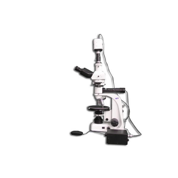 • MT9930: Trinocular MT9930 Polarizing Series with Incident and Transmitted 6V 30W Halogen Polarizing Microscope is an investigative tool for isotropic and anistropic materials. Focusable Bertrand lens, Rotatable Analyzer with 180° graduations. Newly designed Strain free Abbe Condenser 1.25 N.A. with a swing out top lens and built in iris in a dovetail mount is easy to change and operates and tracks very smoothly and predictably facilitating accurate iris control with improved usability. Newly improved ∞ Infinity Corrected Objectives ICOS Optical System. Ceramic coated, 175mm diameter, ball bearing, circular rotating stage graduated 360°, with 1°increments and vernier reading to 0.1°. Polarizer in a swing in-out click/clamp mount, fully rotatable 360° with click stop at 0°and 90°.