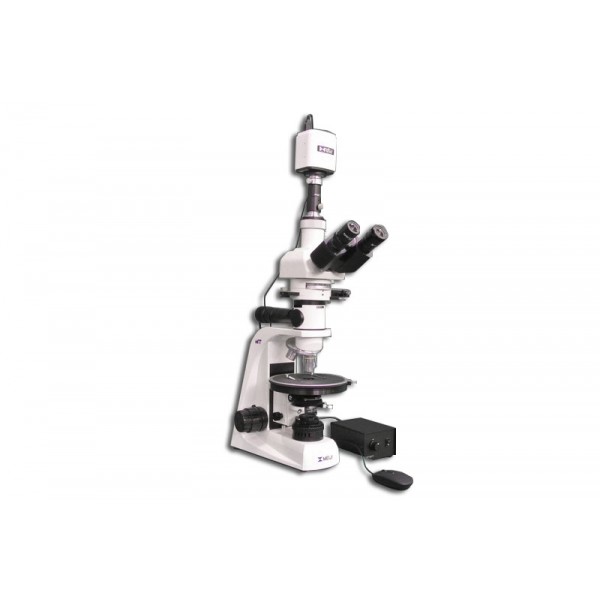 • MT9930: Trinocular MT9930 Polarizing Series with Incident and Transmitted 6V 30W Halogen Polarizing Microscope is an investigative tool for isotropic and anistropic materials. Focusable Bertrand lens, Rotatable Analyzer with 180° graduations. Newly designed Strain free Abbe Condenser 1.25 N.A. with a swing out top lens and built in iris in a dovetail mount is easy to change and operates and tracks very smoothly and predictably facilitating accurate iris control with improved usability. Newly improved ∞ Infinity Corrected Objectives ICOS Optical System. Ceramic coated, 175mm diameter, ball bearing, circular rotating stage graduated 360°, with 1°increments and vernier reading to 0.1°. Polarizer in a swing in-out click/clamp mount, fully rotatable 360° with click stop at 0°and 90°.