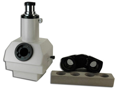 Trinocular Siedentopf head, erect image, inclined at 30°, I.P. adjustment 53mm to 75mm graduated diopter on left eyetube (30mm I.D. eyetubes) with depolarizer. Includes 0/100 beam splitter (100% to eyetubes or 100% to phototube).