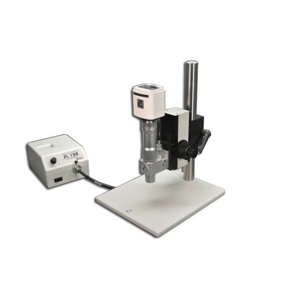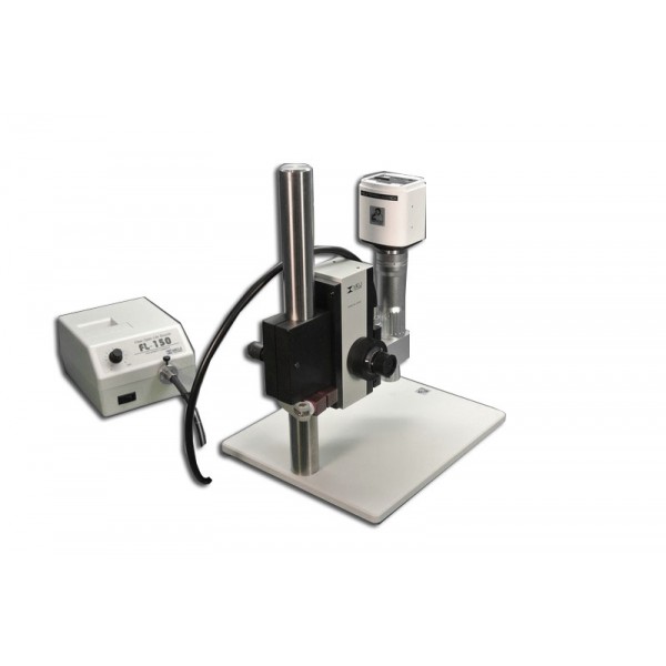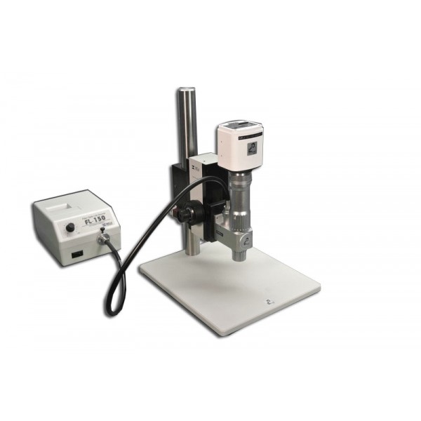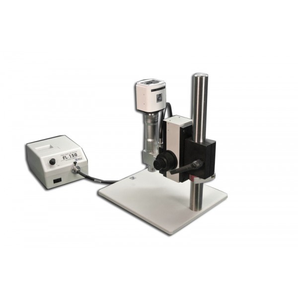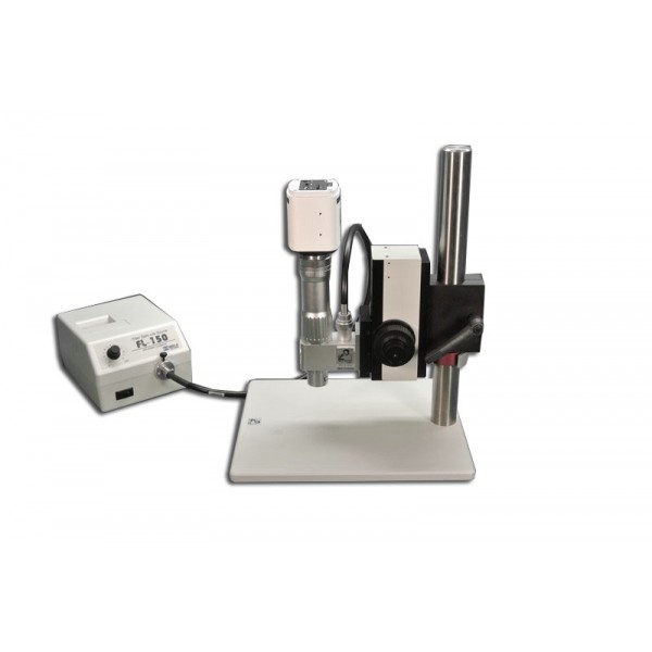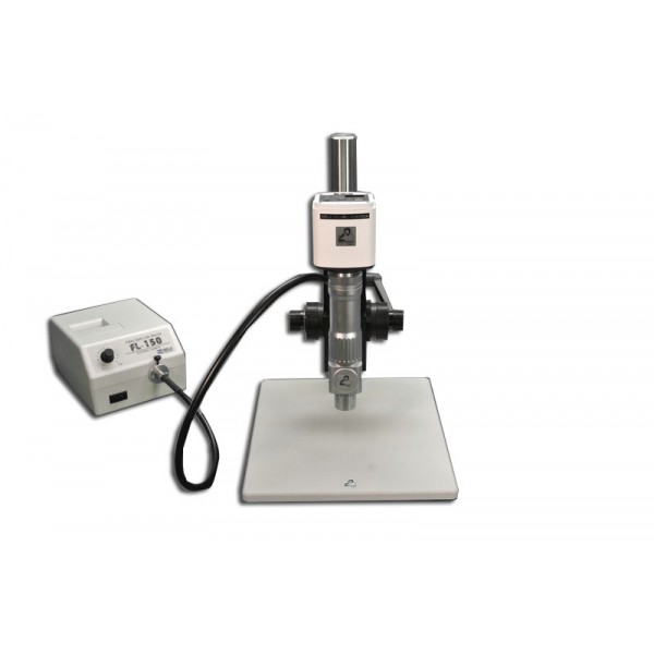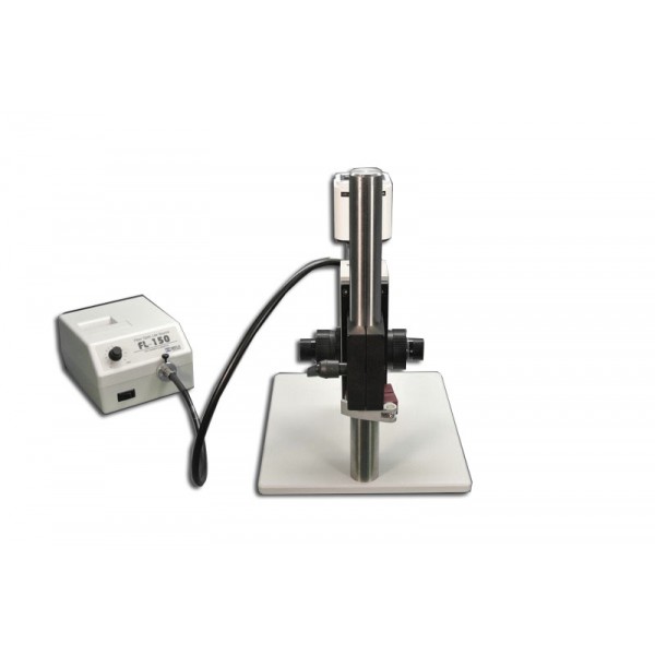 In this configuration, the MC/DZ4-T is a combination of the DZ4-T body and the focus block (DZ-T/38). The DZ4-T is a zoom microscope body that has a magnification of 0.83X to 10X (zoom ratio 12:1). The DZ-T/38 is a coarse and fine focus block that fits a 38mm mounting post which are most of our pole stands. The ZC15 equipped with the DZ4-T is a 1.25X – 15X infinity objective. It gives the system a 75X – 900X total mag and a working distance of 46.2mm. The MAC-10 stand is a heavy duty stand that has a mounting bracket to accept optional such as the DZ-T/38 or the FU1010. The MAC-10 has a 16" height and 1.5" diameter stainless steel vertical post. It also has a quick release safety clamp. In addition, the FL150/115 attached is a unit that offers safe and hassle-free operation and mates securely with standard FL150/115 microscopy light guides, eliminating adapters. Standard FL150/115 provides a lamp life of over 200 hours at full intensity. This unit is available separately or as part of a complete fiber optic illumination system.