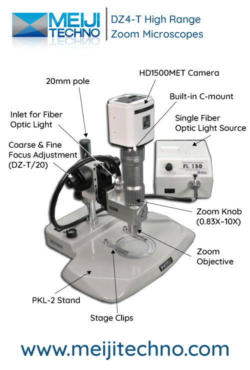 The DZ4-T is Meiji Techno’s highest magnification zoom system in our product line. Viewing samples on a monitor without eyepieces is now easily achievable with the DZ4-T system. You can connect cameras that can be used independently or connect to HDMI monitors or computers with measurement capabilities. It has a zoom ratio of 12:1 and stepless magnification change from 25.2X to 4200X with changing objective. This system has a built-in C-mount lens system that accommodates 1/2" CMOS, CCD or analog cameras in the market. It provides a very high and clear resolution that displays a crisp picture on any monitor. The DZ4-T can be ordered with a focus mechanism that fits a 38mm (1.50") post or a 20mm (0.78") post stand. It has an integrated single arm fiber optic coaxial reflected illumination with choices of Halogen or LED light sources. The system can be equipped with a reflected or transmitted light stage that accommodates the Mitutoyo digimatic indicators for X, Y or Z accurate measurement capabilities. The DZ4-T has the ability to reach different viewing positions quickly at low magnification and magnifies images effortlessly. It can be used with various types of illuminations and has a wide application range.