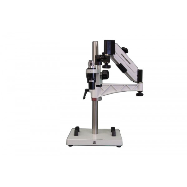 In this configuration there is a MS-40D is a short unimac macro zoom lens that has 0.28X - 1.8X magnification and also has a C-mount adapter. The MS-40D working distance is 94mm. The MS-51/05 is a coarse focus block that fits 20mm mounting post, 45mm for the Short Unimac System. The SAS-2 attached is an articulating heavy duty industrial-type boom stand comes with a 20mm diameter drop down mounting post to perfectly complement our EMZ (Zoom), EMT (Turret), EMF (Fixed) Series Stereo Microscope with the proper focus block. Lift Articulating Arm offers the greatest amount of reach along with ease to vertical positioning. The total arm length gives the user a total of 37” from the center of the vertical pole to the center of the focus block.