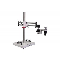 The BAS-2 Heavy Duty Boom Stand is Meiji Techno America’s most popular Ergonomic boom stand with a pillar, a cross-arm and a 20mm drop down mounting post that accepts industry standard focus blocks with a 20mm mounting hole. The BAS-2 is equipped with a 635mm (25”) vertical pole and a 457.2mm (18”) horizontal pole. The BAS-2 offers minimal space requirement and greatest possible amount stability for EM stereo system up to 30 lbs. There is no loss of stability even at its furthest travel. The BAS-2 can swing out of the way easily, clearing the workstation for other tasks. The horizontal arm can be moved freely and smoothly left to right or can be securely locked into position with our spring loaded handle knobs. The vertical column is used to compensate for taller specimen heights to accommodate the working distances of different microscope bodies. Anti-rotation is stabilized by a locking pin on the vertical post. The BAS-2 Heavy Duty Boom stand provides a comfortable amount of space for large Solar panels to large semiconductor and electrical components. The BAS-2 is supported by a 80.00 lbs base. This boom stand is an affordable; low cost with high quality safety features makes this boom stand unmatched value in its class. This stand has ample height and long reach to work on an inspect small to large parts under the microscope. Ergonomic flexibility, chemical resistant paint finish and corrosion resistant stainless steel columns make this boom stand an excellent choice in labs and production facilities.