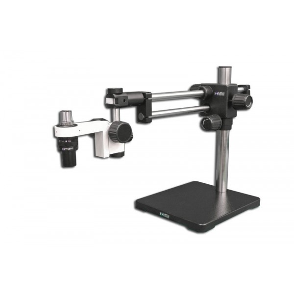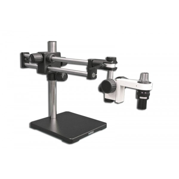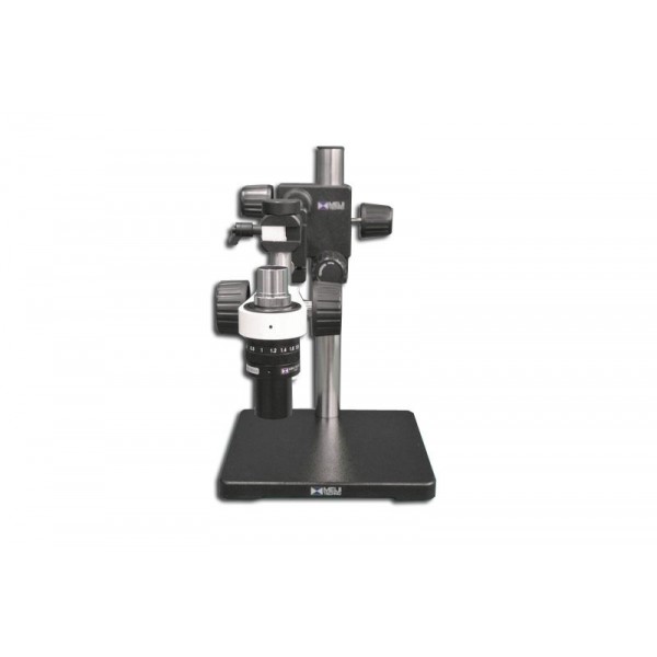 In this configuration there is a MS-45D is a short unimac macro zoom lens that has 0.41X - 2.6X magnification and also has a C-mount adapter. The MS-45D working distance is 94mm. The S-2100 base is a universal dual arm boom  stand with 20mm mounting post that includes a MS-51/05 coarse focus block that fits on 20mm mounting posts. The S-2100 is a 39.8lbs stand that has a vertical pole 15.11" (384mm) with a diameter 1.46" (37.2mm) and a 5/8" bonder pin acceptance (Base 285x260x15mm). This is a standard configuration for a short unimac system a universal boom stand.