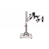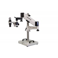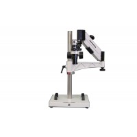In this configuration there is a MS-50R is a short unimac macro zoom lens that has 0.7X - 4.5X magnification with iris and also has a C-mount adapter. The MS-50R working distance is 94mm. The MS-51/05 is a coarse focus block that fits 20mm mounting post, 45mm for the Short Unimac System. The SAS-2 attached is an articulating heavy duty industrial-type boom stand comes with a 20mm diameter drop down mounting post to perfectly complement our EMZ (Zoom), EMT (Turret), EMF (Fixed) Series Stereo Microscope with the proper focus block. Lift Articulating Arm offers the greatest amount of reach along with ease to vertical positioning. The total arm length gives the user a total of 37” from the center of the vertical pole to the center of the focus block.